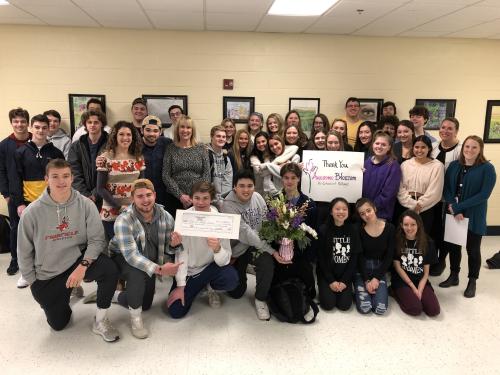 Working to help support young artists in the community, Awesome Blossom created the Arts Benefactor Fund.  A portion of the proceeds on flowers delivered within Cohasset is donated to the Cohasset High School Fine Arts department. As of May 2022, Awesome Blossom has donated a total of $5000 to CHS. Pictured above In May 2021, Marybeth Lynch presented the Cohasset Fine Arts Department with a donation of $1400.00 through it's Arts Benefactor Fund. In February 2020,