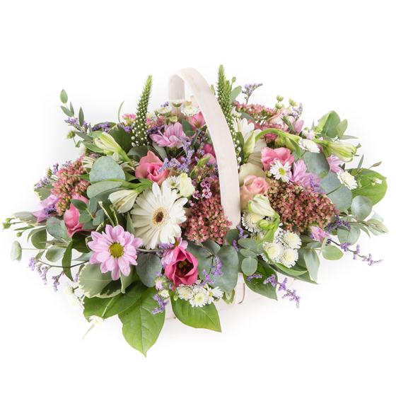 A pastel collection of dainty blooms in pinks, whites and lilacs, including roses, sedum, limonium, wax flower and lisianthus. Made with the freshest flowers - some may be substituted based on season/availability.