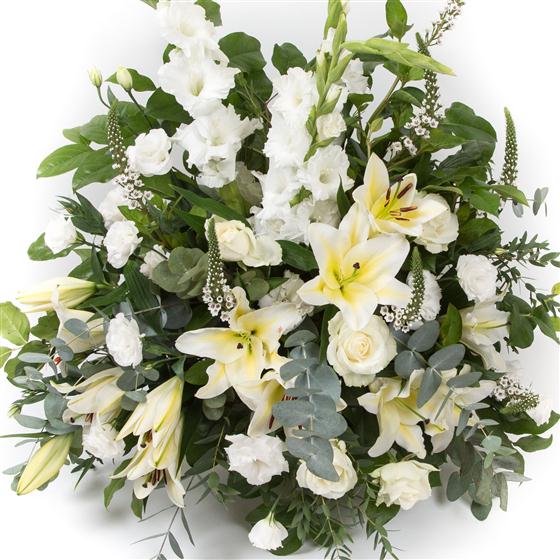 An all white triangular arrangement including seasonal white flowers. Made with the freshest flowers - some may be substituted based on season/availability.