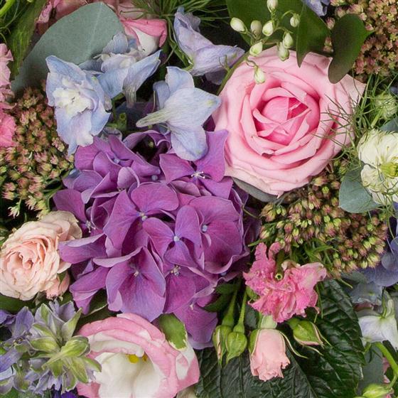 Larkpsur, hydrangeas, delphiniums, sedum, nigella, roses and lisianthus are included within this seasonal, summer bloom wreath. Made with the freshest flowers - some may be substituted based on season/availability.